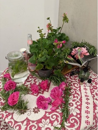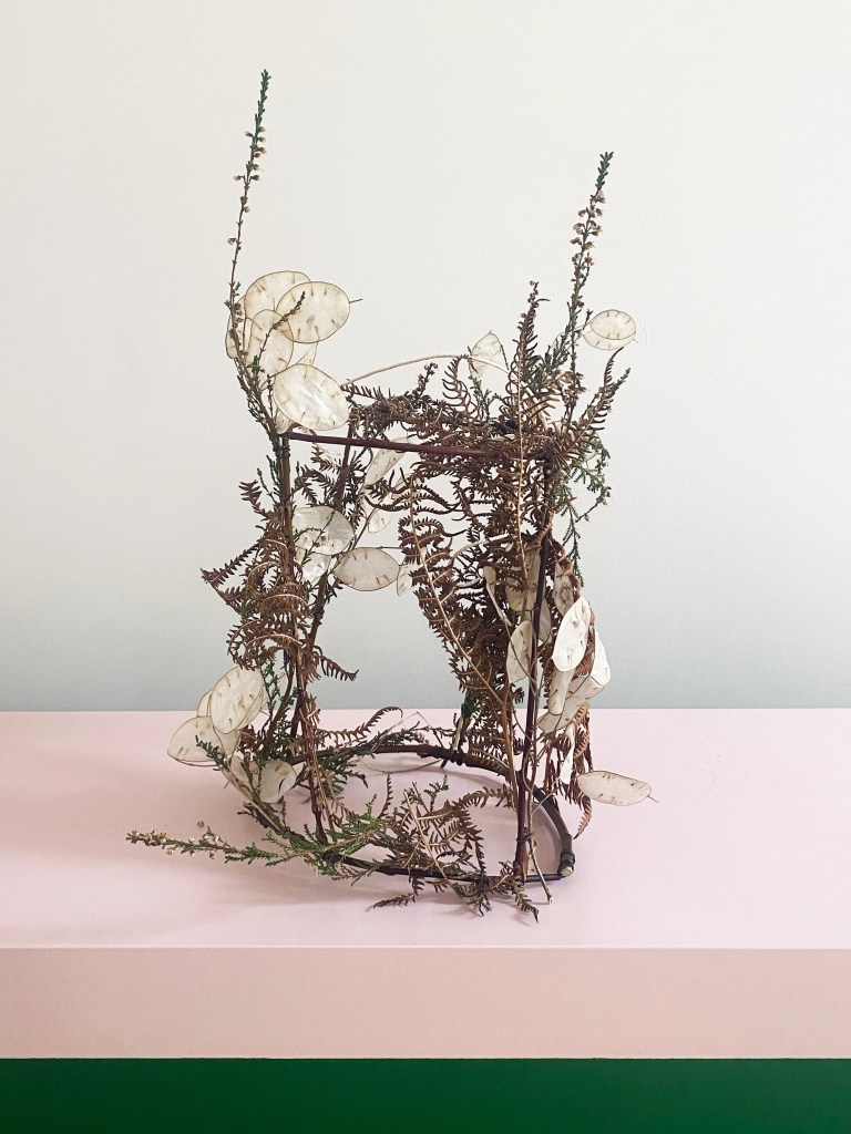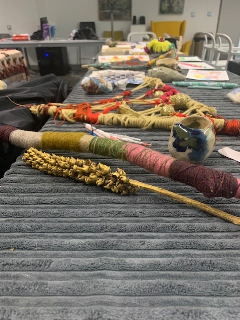 Figure 5 and Figure 6. Photo Description: Two ecology of care display tables using flowers to feature the restorative capacities of using natural materials for attention restoration within a classroom setting. Attention Restoration Theory suggests that natural materials encourage immersion and soft fascination two features that stimulate an escape from habitual patterns of rumination, a cycle of negative thinking apparent within anxiety, low mood and depression (Ohly et al., 2016). Left Photograph: An ecology of care table presented at the Wellbeing and Belonging Showcase at Ulster University (June, 2025). Right Photograph: A sculpture by art psychotherapy graduate Sarah Wilson, titled As We Are, for an art making studio on the theme of Carriers of Life (MSc Art Psychotherapy, 2023a).