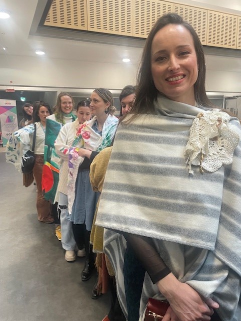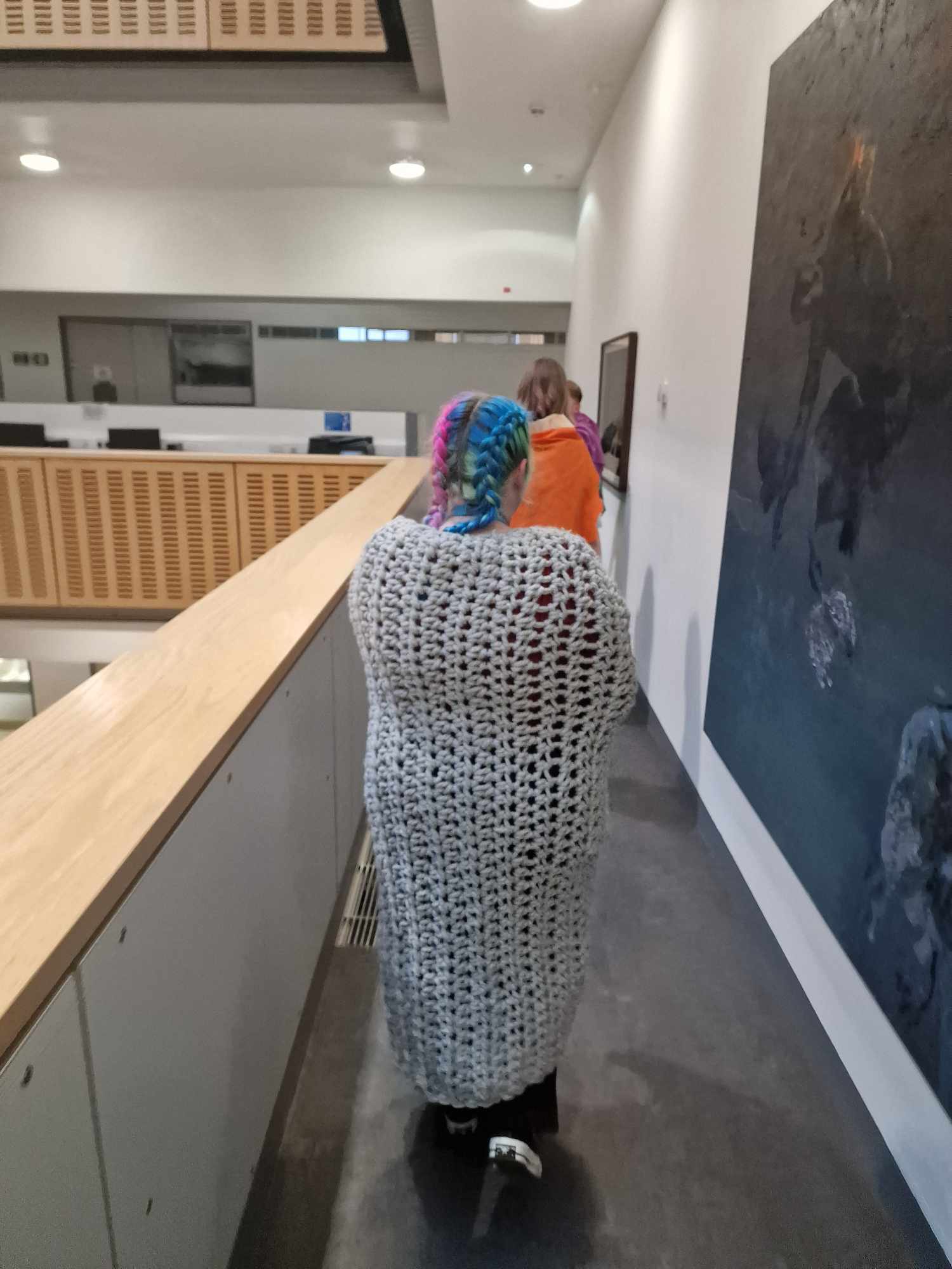 Figure 1 and Figure 2, MSc Art Psychotherapy learners wearing the capes, blankets, cloaks and shawls they made as wearable art during a poetry workshop. These items could also be considered portable ecologies of care (MSc Art Psychotherapy, 2024).