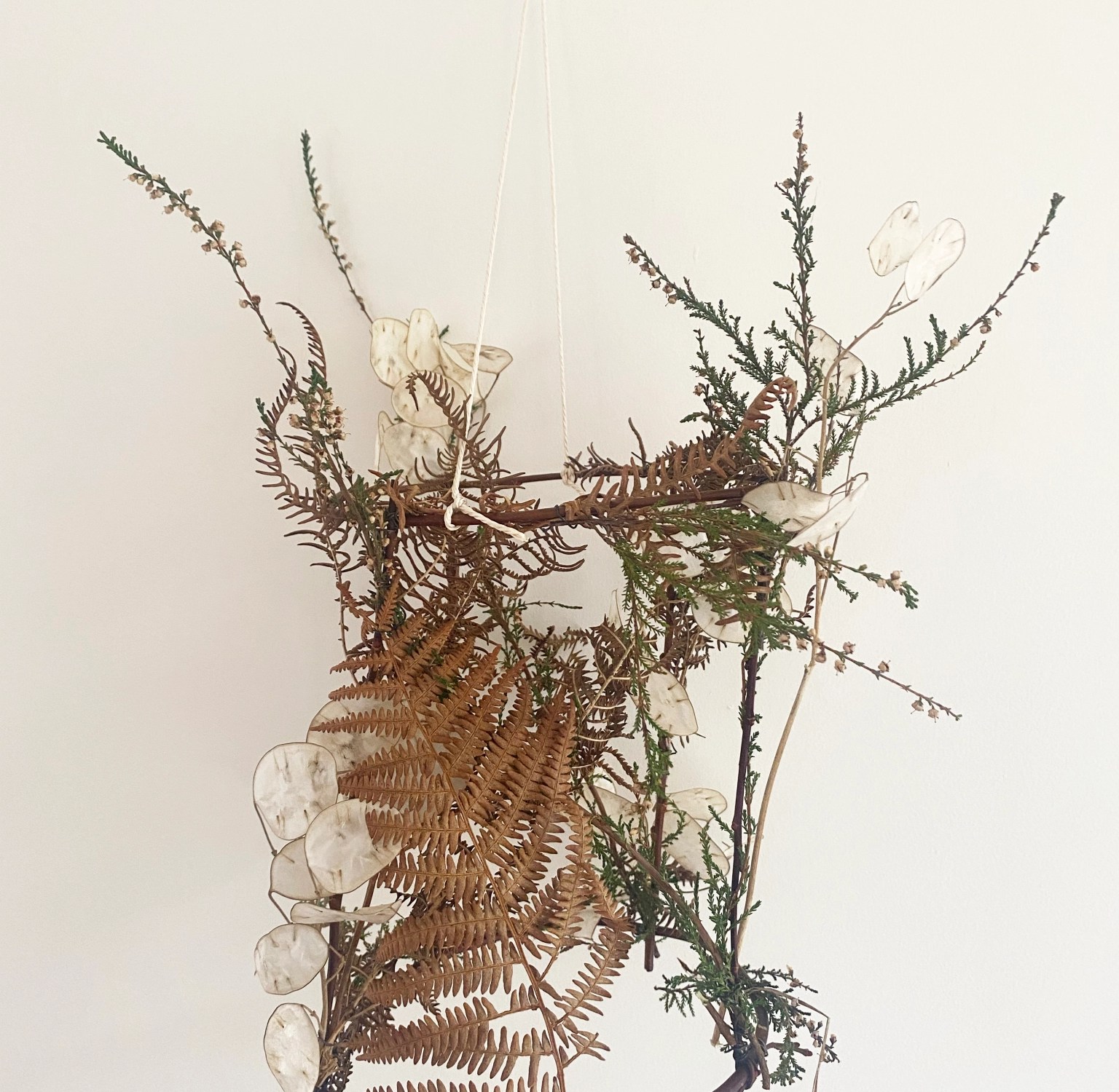 Figure 5 and Figure 6. Photo Description: Two ecology of care display tables using flowers to feature the restorative capacities of using natural materials for attention restoration within a classroom setting. Attention Restoration Theory suggests that natural materials encourage immersion and soft fascination two features that stimulate an escape from habitual patterns of rumination, a cycle of negative thinking apparent within anxiety, low mood and depression (Ohly et al., 2016). Left Photograph: An ecology of care table presented at the Wellbeing and Belonging Showcase at Ulster University (June, 2025). Right Photograph: A sculpture by art psychotherapy graduate Sarah Wilson, titled As We Are, for an art making studio on the theme of Carriers of Life (MSc Art Psychotherapy, 2023a).