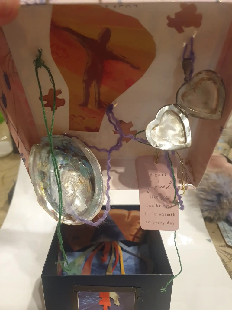 Figure 9 and Figure 10. An artwork by Maggie Mulhare for an art psychotherapy studio practice on the topic of sculptural lifelines and assembling narratives through found and personalised objects (MSc Art Psychotherapy Blog, 2023).