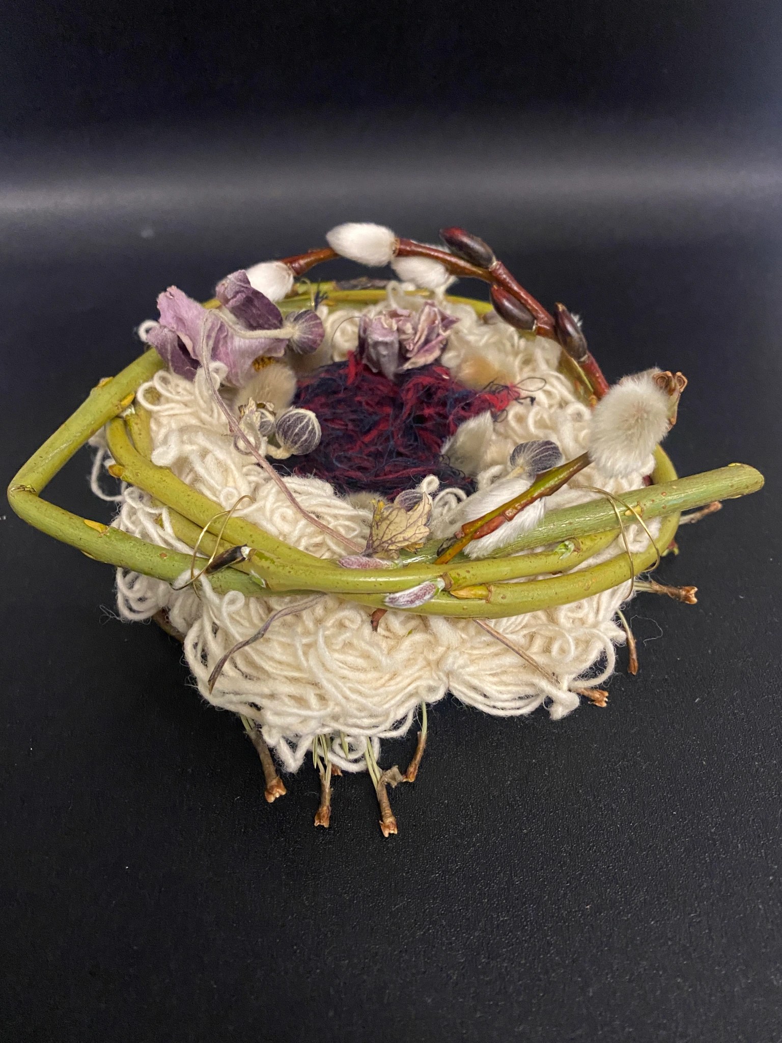 Figure 1, Figure 2, Figure 3 and Figure 4. Art psychotherapy learners created mixed media nests as a psychological base for comfort, nurturance, creativity and resourcefulness—all conditions for higher education learning. These nesting habitats align with the reflective practice themes of holding and security within the practice of art psychotherapy (MSc Art Psychotherapy, 2024).