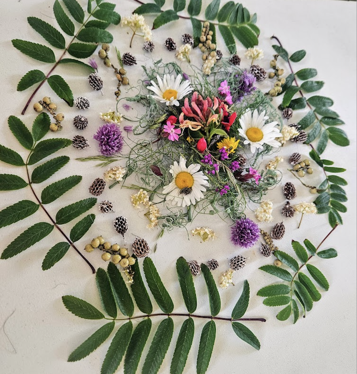 Figure 8. A group tablescape created during an ecology of care workshop. Both a centrepiece and a focus point for gathering, this collaborative assemblage was produced as a witnessing of the changing of a season. Whitaker, P. (2025) Personal Collection.